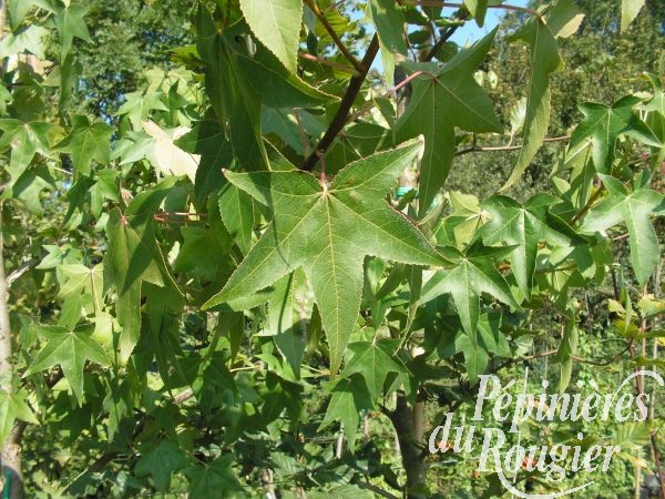 Connu également sous le nom de Copalme d' Amérique c' est un arbre d'une vingtaine de mètres de haut au port pyramidal . Sa feuille ressemble à celle de l'érable, mais chez lui elles sont alternes, alors qu' elles sont opposées sur les érables . En automne elles prenent une jolie teinte cuivrée . Son bois présente un aspect liégeux même s' il est jeune . Ses fruits globuleux, épineux, pendant restent longtemps sur l' arbre en hiver. Il préfère une exposition chaude mais ne craînt pas le froid hivernal . Il affectionne un sol frais non calcaire et de préférence riche en matières organiques . Sa variété "worplesdon" présente des coloris automnaux très chatoyants et n' atteint que 15 m . On extrait de cet arbre une résine parfumée connue sous le nom de storax .