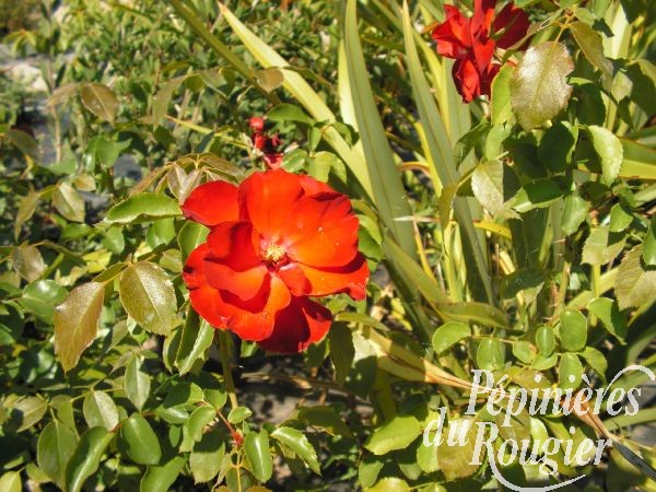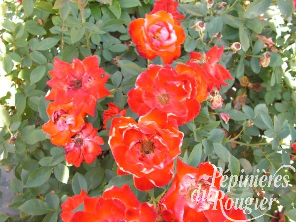 - " la sevillana " : développement de 3 m, fleur 6 cm, rouge vermillon, en bouquet,très bonne remontée et très florifère, existe en rosier arbustif