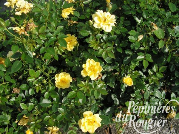 - " yellow fairy " : fleurs de 5 cm groupées en grappes, jaune vif à l' éclosion puis vire au blanc, très bel effet de juin aux gelées